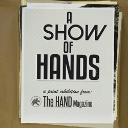 A Show Of Hands, is a collection of prints and photographs curated by Adam Finkelston and James Meara, co-editors of The Hand Magazine. Since April 2013, The Hand Magazine has published hundreds of images from some of the most interesting contemporary artists working in reproduction-based media. The Hand is dedicated to the promotion of hand-made images that utilize techniques invented for and generally thought of as being mechanical in nature. In addition to exploring this paradox, The Hand seeks to unite the photographic and print communities and give a new audience to established practitioners of these arts. The Hand reaches out to established and emerging artists alike, in an effort to recognize the history of hand- made reproduction as well as the future. The artists in this exhibition exemplify these ideas. (Applause).