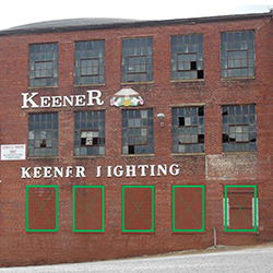 Using woodcuts, screenprints and monoprints, Michael Siporin Levine piece “Windows” creates a site-specific work for the Keener Lighting Building that reacts to the vacant/boarded-up window spaces. Themes, ideas and imagery presented in this installation include the imagined interior space, light/lamps/light fixtures, and the history of the Keener Lighting Co. Levine contacted family members of the Keener Lighting Co, who provided him with images of the company from its early days. The work also references historic images from Knoxville Power and Light Co. obtained through the Knox County Public Library Digital Archives.