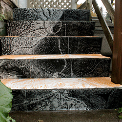 In “Folio Vestigium,” Margot B. Myers and Amy S. Porter present a large, modular woodcut printed on evolon paper, cut into strips and temporarily pasted to the riser of each step at the L&N STEM Academy. The images on the stair risers become coherent at a slight distance from the stairs, not unlike a giant unfolded accordian book. On the treads, prints of the same plates made with a contrasting ink will be pasted in a different configuration. Participants alter the work with residual dirt or oils on their shoes as they walk it. As viewers enter the installation, the larger image will become fragmented but their visual experience will become more intimate as they are able to see detailed parts of the prints up close.
