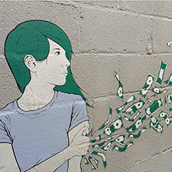 For her work “Flow,” Tonja Torgerson creates a screenprinted installation which is wheat-pasted into public environments. This work consists of large screenprints on newsprint that are cut out into individual pieces and then pasted directly unto an outdoor surface. The piece consists of a female figure covering a wound in her arm, from which a cloud of money is streaming. This work considers the vulnerability of the body, allowing for a moment of discovery by presenting itself in an unexpected location. The work’s temporality mirrors the impermanence of our own lives, at first seemingly endless but quickly degrading until completely dissolved the matter of the world.