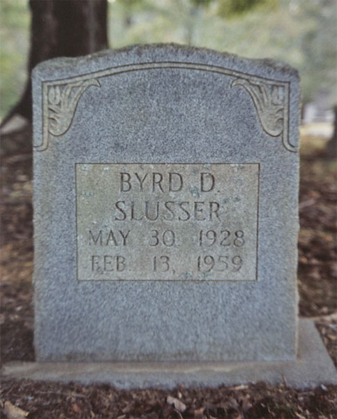 Byrd D. Slusser, Jr. was born on May 30, 1928, to Byrd D. and Josie C. Slusser. Byrd was arrested in July 1951, for unlawfully appropriating a 1948 Chevrolet from the Tennessee Valley Motor Co., and he was charged with Fraudulent Breach of Trust. After multiple trial delays the charges against Slusser were dismissed on October 25, 1952, because by that time he was in the Federal Penitentiary. Byrd died on February 13, 1959, at the age of 31. He was survived by his parents, three sisters and four brothers. Byrd is buried in the Solway Methodist Church Cemetery.