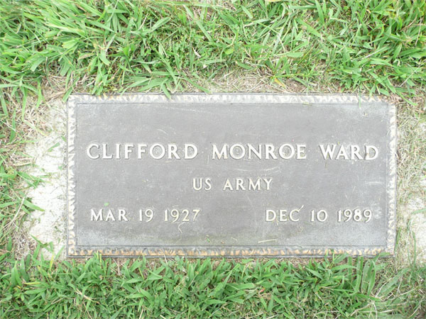 Clifford Monroe Ward was born on March 19, 1927, a son of Otha L. and Bulah K. Ward and nephew of W. D. Ward. He died on December 10, 1989, and is buried in the Stock Creek Baptist Church Cemetery.