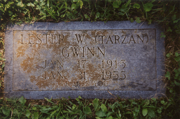 On January 31, 1955, Tarzan Gwinn died in Knoxville General Hospital of five gunshot wounds suffered in a shoot-out with Roy Porter at the home of Robert and Margaret Van Winkle. Gwinn is buried in New Gray Cemetery.