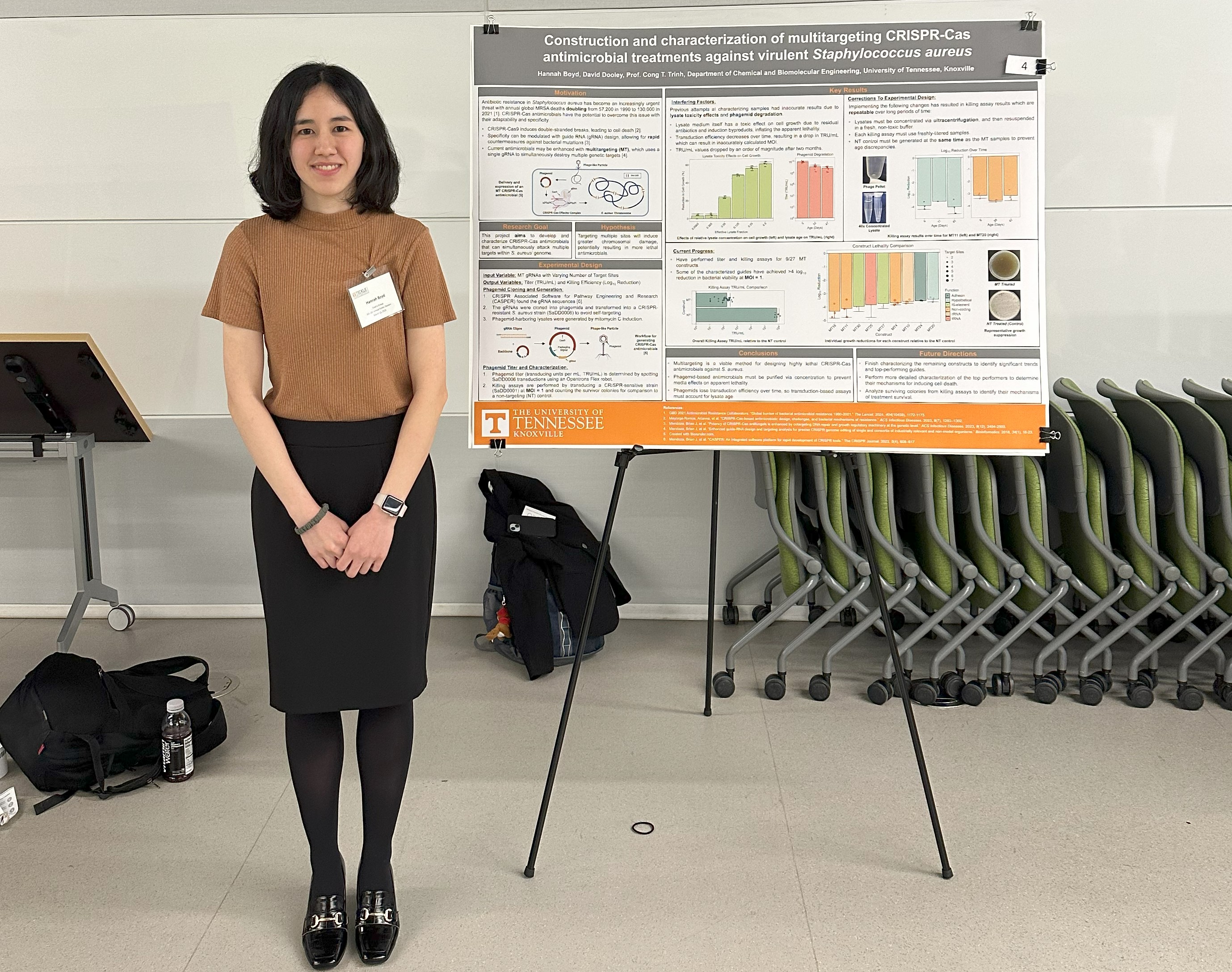 03/23-03/27/2025: Chris Cotter and Trinh attended ACS Spring Meeting in San Diego and presented our work on CRISPR-GRIT, a powerful CRISPR-based genome editing tool to edit difficult-to-manipulate fungi, Candida albicans with a diploid genome and a lack of replicating plasmids. The ability to fuse a short fragment of repair template and tRNA in guide RNA eliminates the need to use a separate large repair template and increase editing efficiency. CRISPR-GRIT is ideal for enabling high-throughput functional genomics! 03/13/2025: Our undergraduate student, Hannah Boyd, presented her co-targeting ViPaRe project at the 2025 CBE symposium. Hannah won the 1st poster award! Congrats! See CBE news. |