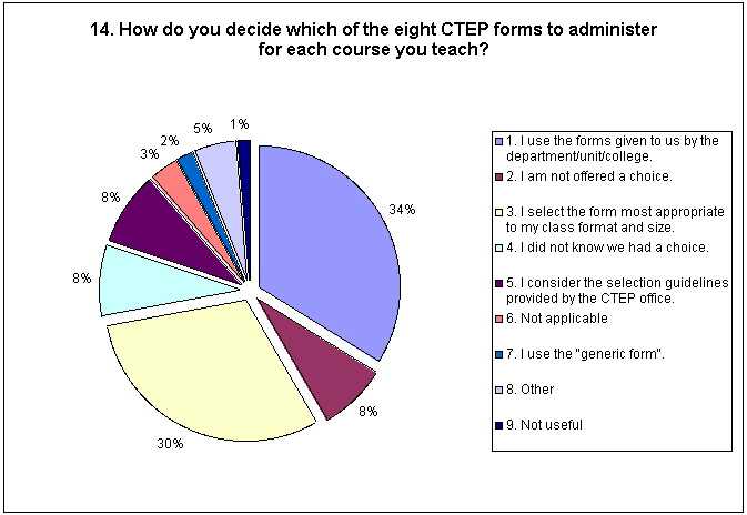 The first open-ended question in the survey, Question 14 asked how each instructor decided which of the eight CTEP forms to administer for each course they taught. As indicated on the attached chart, the most common response provided was that instructors used the forms given to them by the department/unit/college (157 responses for 34%) followed closely by the instructors who chose the form most appropriate for their class format and size (139 responses for 30.1%). Roughly eight percent of the respondents (36 responses for 7.8%) said they were not offered a choice, while another eight percent of the respondents (39 responses for 8.4%) said they weren't aware they had a choice. Eight percent of the respondents also indicated their decision was based on guidelines provided by the CTEP office.