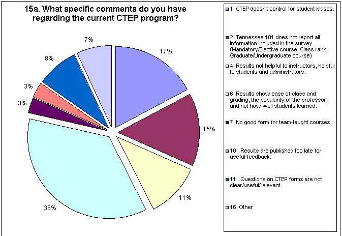 Of the respondents who made specific comments about the current CTEP, as indicated on the chart for 15a, over one-third (95 responses for 36%) thought the results showed the ease of the class, ease of the grading scale, and the popularity of the professor, rather than how well students learned. Seventeen percent (45 responses) of the instructors believed the current program did not control for student biases (such as race and gender of the instructor, student's class rank, etc), while 15 percent (38 responses) of the instructors did not believe that Tennessee 101 reported all relevant information acquired in the survey (whether a course was mandatory or elective, class rank of those being surveyed, etc.). [Note: Tennessee 101 is the Student Government Association's (SGA's) publication of the CTEP results and the format and layout of that publication is basically an SGA decision.] One out of ten of the instructors (28 responses for 11%) who made a comment about the program believed the results were not helpful to the instructors, but helpful to the students and administration.