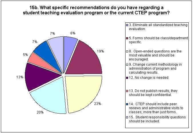 As indicated on the chart for 15b, the most common recommendation made by the instructors concerning any student teaching evaluation program or the current CTEP (67 responses for 23%) was that the use of open-ended questions were the most helpful to them and that their use should be encouraged. Currently the Student Comment Sheets are an optional form used to supplement the mandated scan forms. Closely following the importance of open-ended questions, was the opinion that instructors wanted to see a change in methodology in administration of the current program (56 responses for 20%), and instructors who wanted forms to be class/department specific (53 responses for 19%). Finally, 13 percent of the instructors (36 responses) believe that the current program was sufficient and no change was needed.