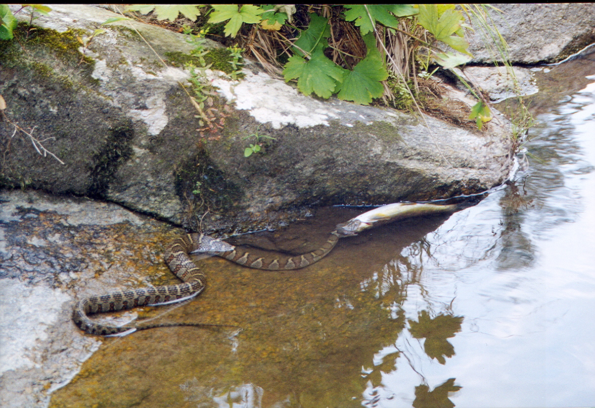 We were relaxing beside a pool where several fairly large brown trout could be seen when we saw a water snake swimming toward the fish. We paid little attention to this because the trout appeared to be too large to be bothered by the snake, but suddenly David yelled, "That snake has caught a fish!" Thus began drama that none of us will ever forget.