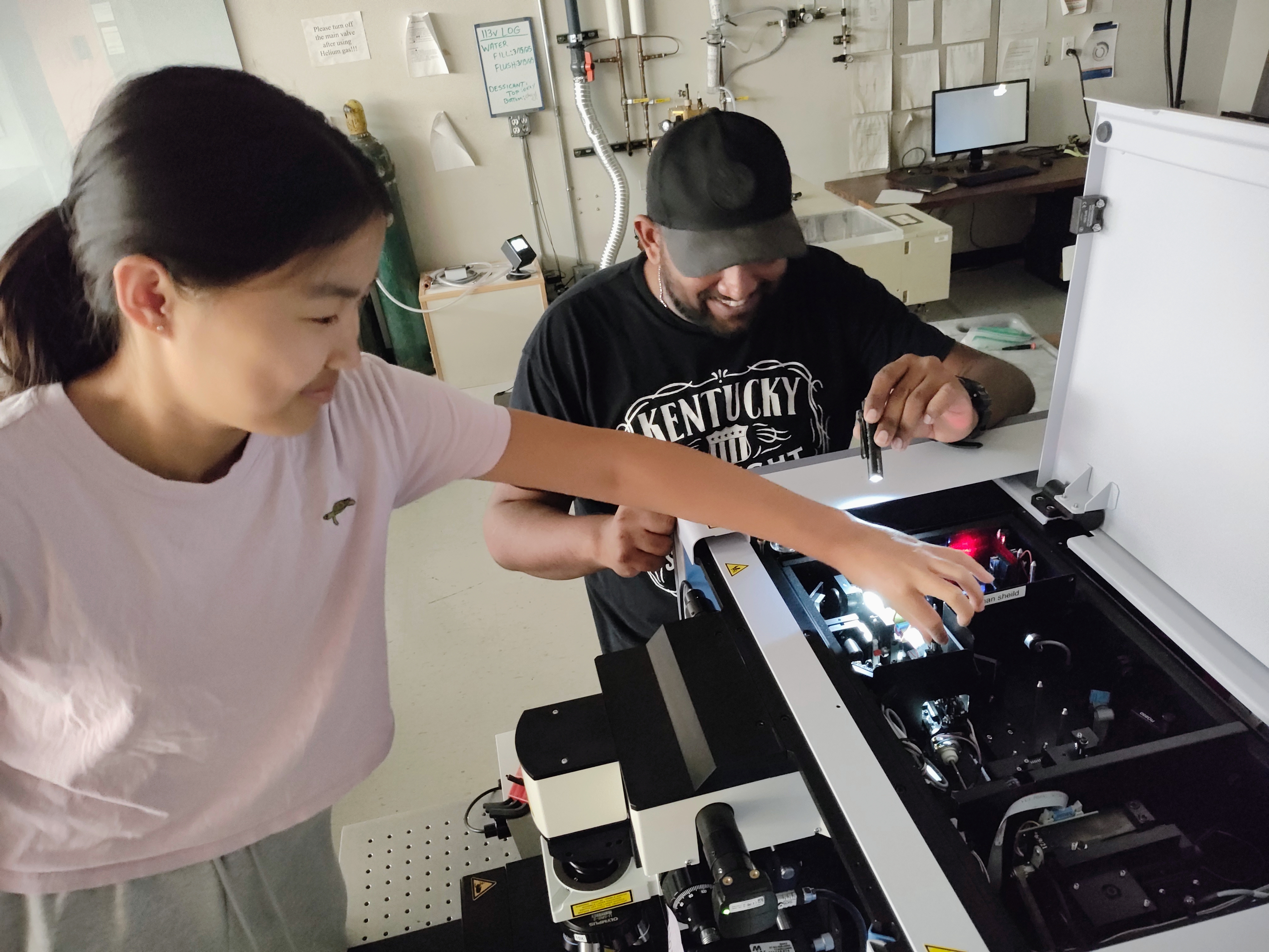 Ella is using her small fingers to help Lakshan insert filters into the Raman after he aligns them.