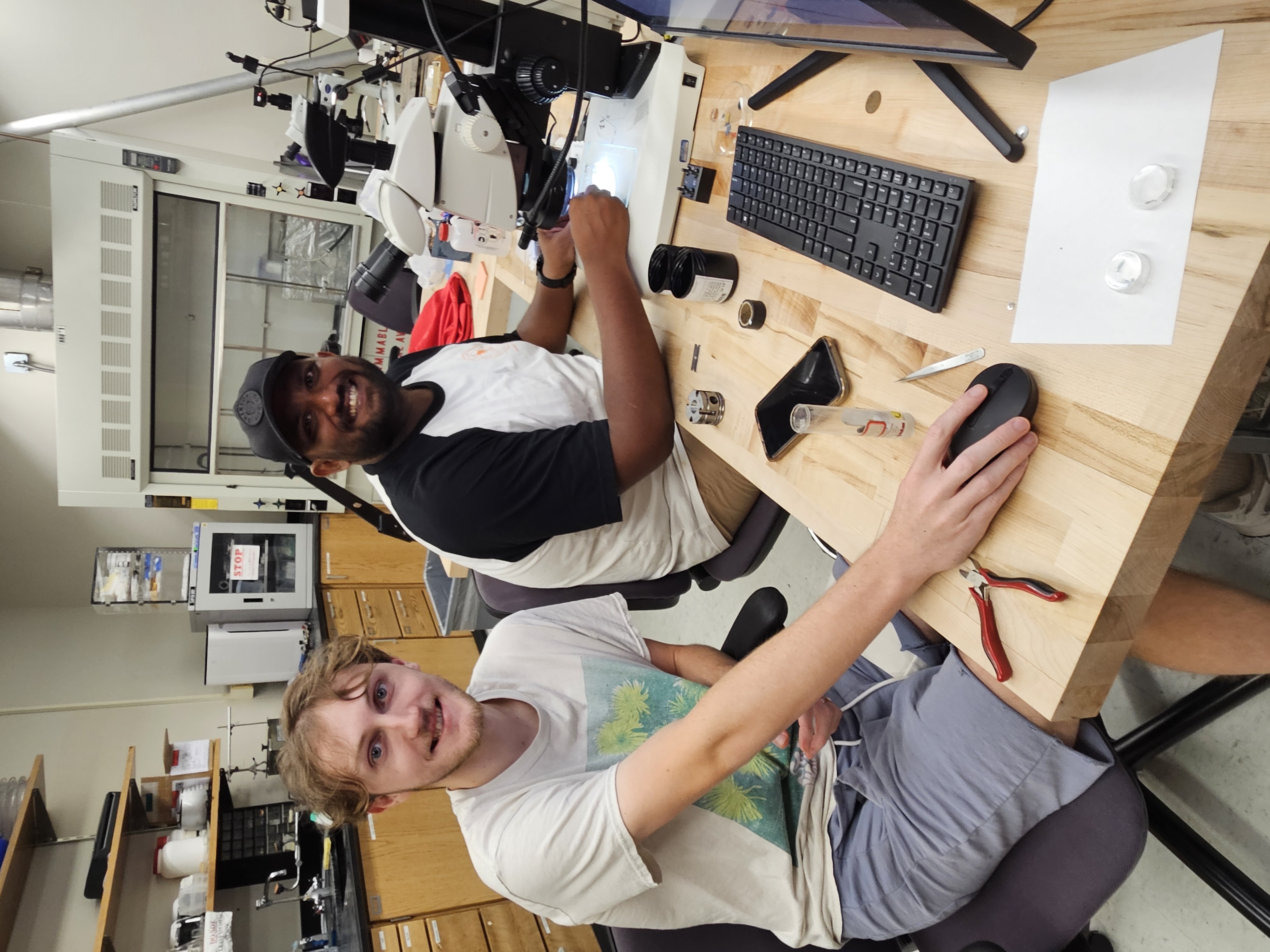 Kevin teaches Brian and Sambridhi how to exfolidate sheets from 2D chalcogenides and view the results using our new stereo microscope.