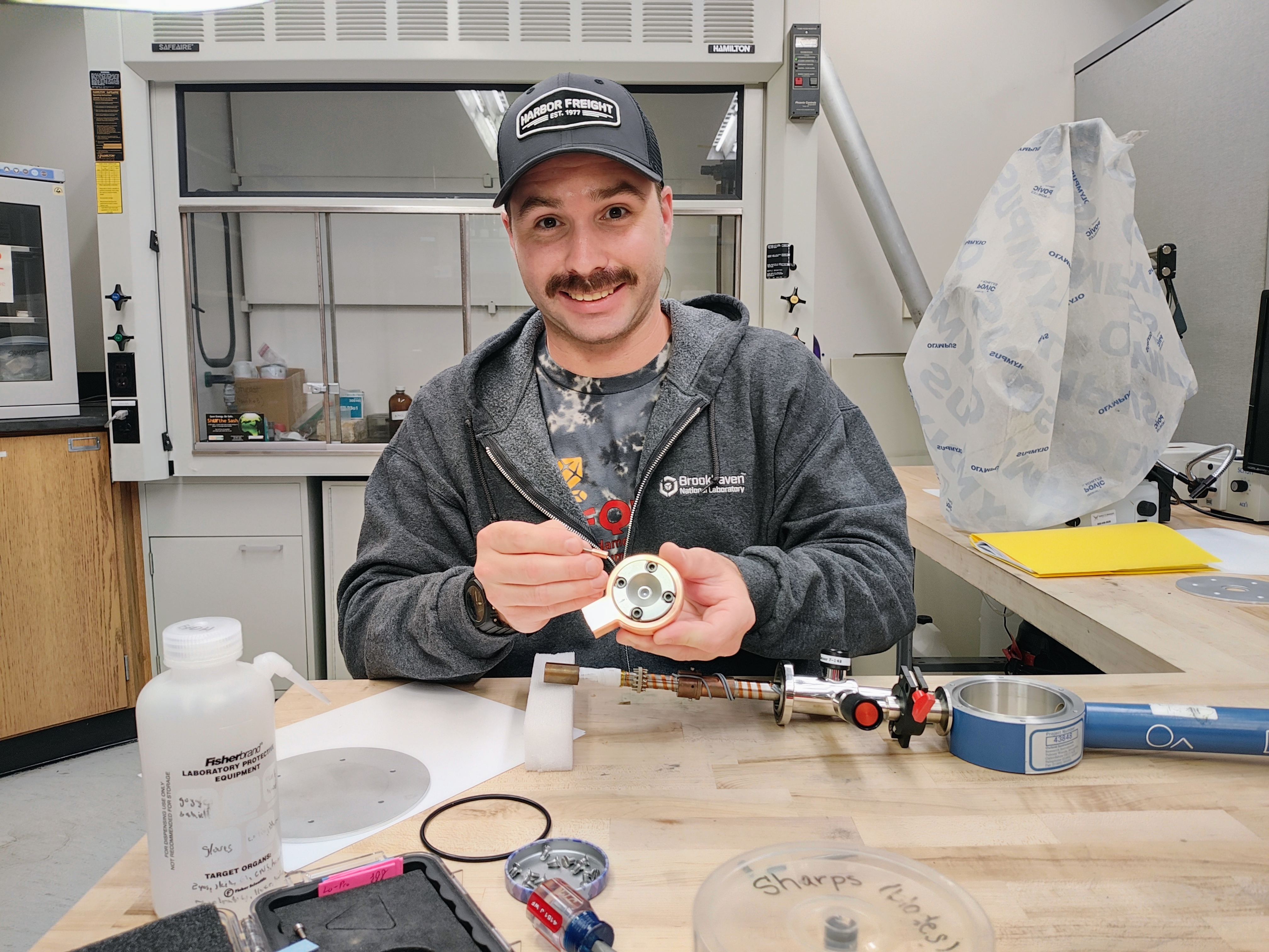 Brian and Sambridhi drill gasket holes at the National Synchrotron Light Source II.